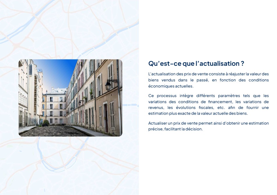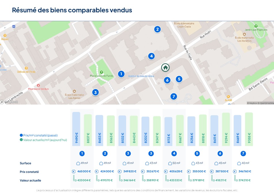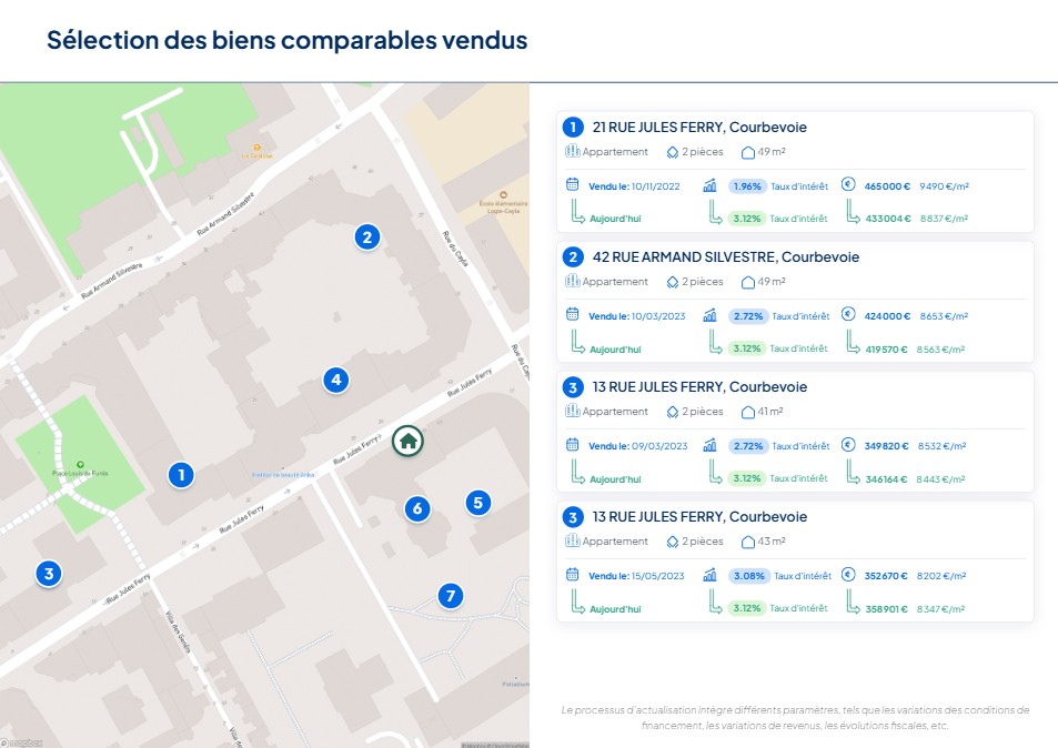 Nous actualisons toutes les ventes en prenant en compte les paramètres qui influencent le marché immobilier (conditions de financement, fiscalité, revenu, etc.).